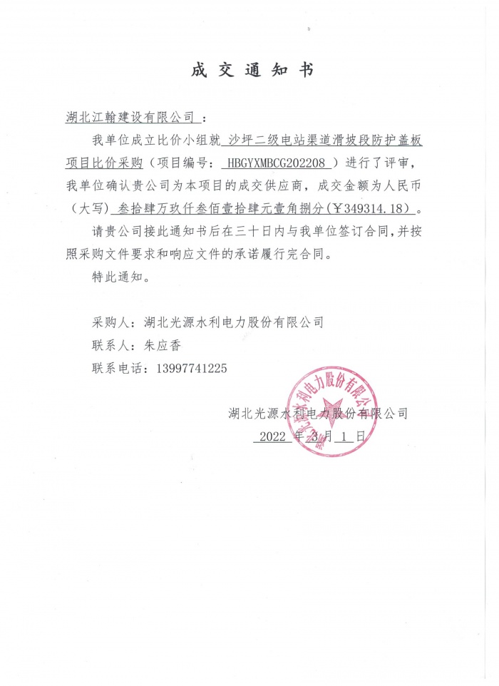 沙坪二级电站渠道滑坡段防护盖板项目成交通知书